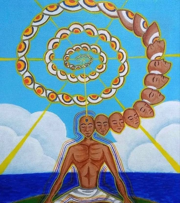 Zwischendurch musste ich dann doch mal die Augen schließen. Und plötzlich tauchten Muster hinter ihnen auf. Bunte Muster. Spiralen. Ich erkannte in der Dunkelheit eine Person im Schneidersitz, um sie herum befand sich eine Art heller Schein. Im nächsten Moment sah ich Dreiecke. Zuerst aufrecht und später umgekehrt.